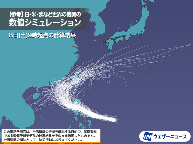 しばらく西寄りに進む傾向は揃っているものの、フィリピンのルソン島を通過した後からは予測のばらつきが大きくなっていることがわかります。台湾付近を通って沖縄方面へ東進する進路を予測しているものもあれば、南シナ海を西進する予測をしているものもあります。