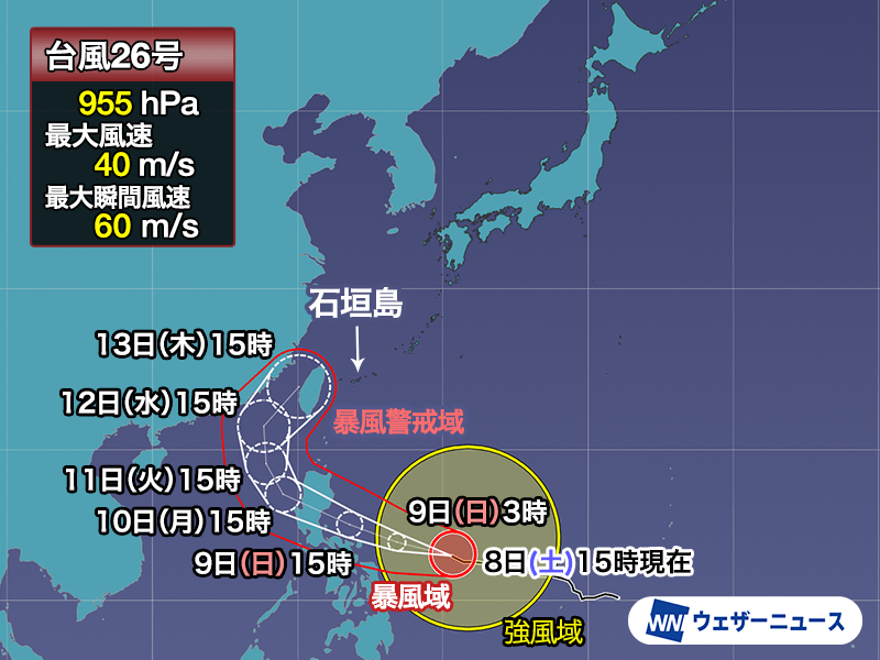 日本からはまだ離れた所を進んでいますが、沖縄では明日9日(日)午後から、先島諸島を中心に台風26号を起源とするうねりを伴った高波が予想されます。その後もしばらく波の影響が続く予想です。