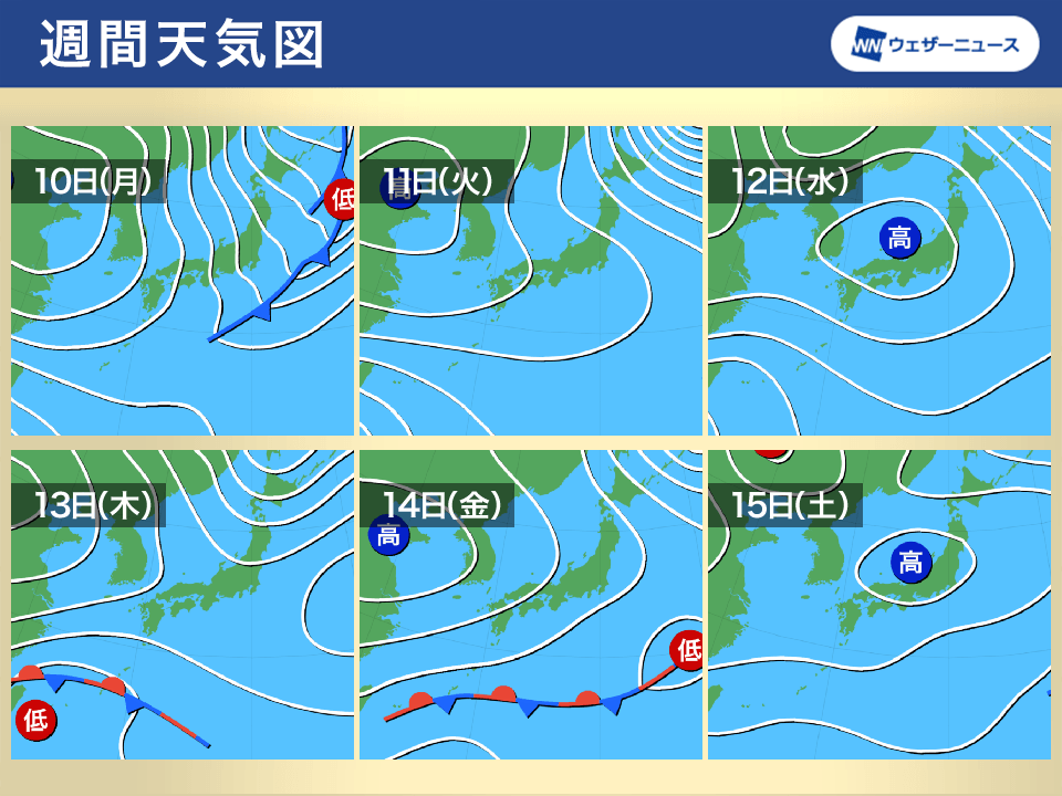 また、沖縄付近では今夜以降、高気圧の縁をまわる湿った空気や台風からの湿った空気が流れ込みやすくなり、次第に停滞前線が形成される予想です。
