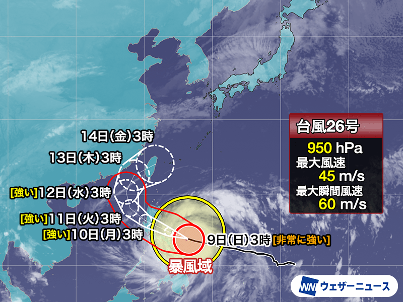 日本からはまだ離れた所を進んでいますが、沖縄では今日9日(日)から台風26号を起源とするうねりを伴った高波が予想されます。その後もしばらく波の影響が続く予想です。