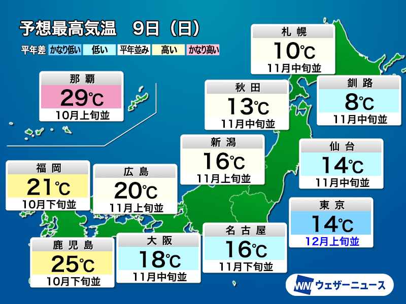 東京では一昨日の7日(金)は気温が平年より高くなり、最高気温は10月中旬並の21.7℃でした。昨日は冷たい東風の影響で気温があまり上がらず、最高気温は11月中旬並の17.5℃にとどまりました。今日はさらに低く、最高気温は12月上旬並みの14℃の予想です。2日間で季節が2か月ほど進んだかのような変化といえます。気温変化で体調を崩さないようにご注意ください。