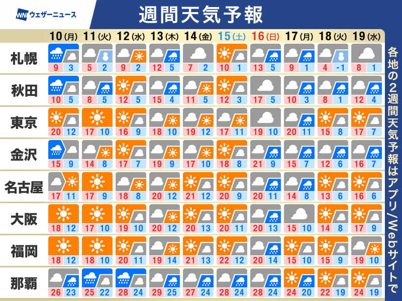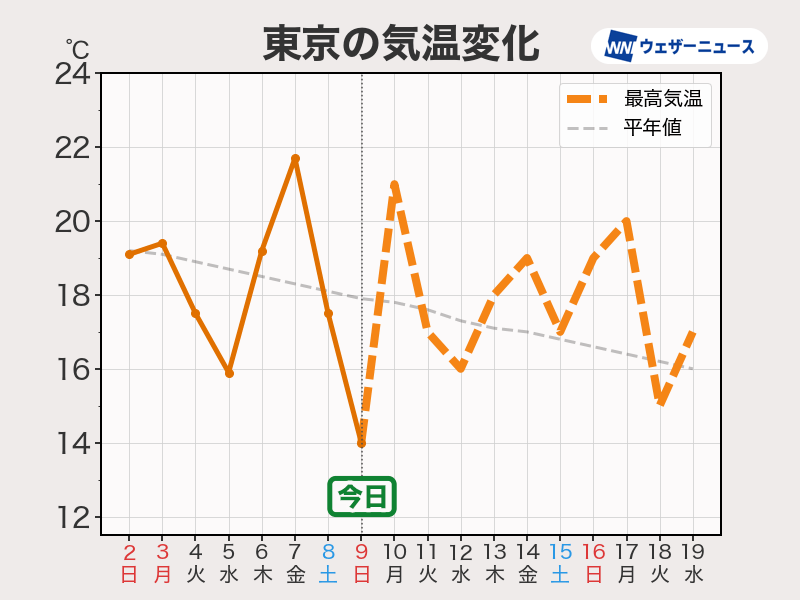 日毎の気温変化が大きいだけでなく、朝晩と昼間の気温差も大きくなるため、服装選びや体調管理にお気をつけください。