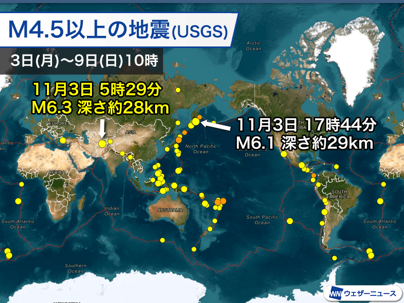 アメリカ地質調査所の解析によるマグニチュード6以上の地震は4回発生しています。最も大きな地震は、アフガニスタンで発生したマグニチュード6.3です。
