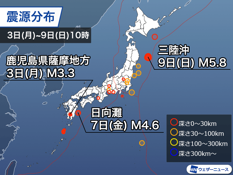 9日(日)7時15分頃、三陸沖を震源とするマグニチュード5.8、深さ約10kmと推定される地震が発生しました。この地震で岩手県盛岡市、矢巾町、野田村で最大震度3を観測しています。