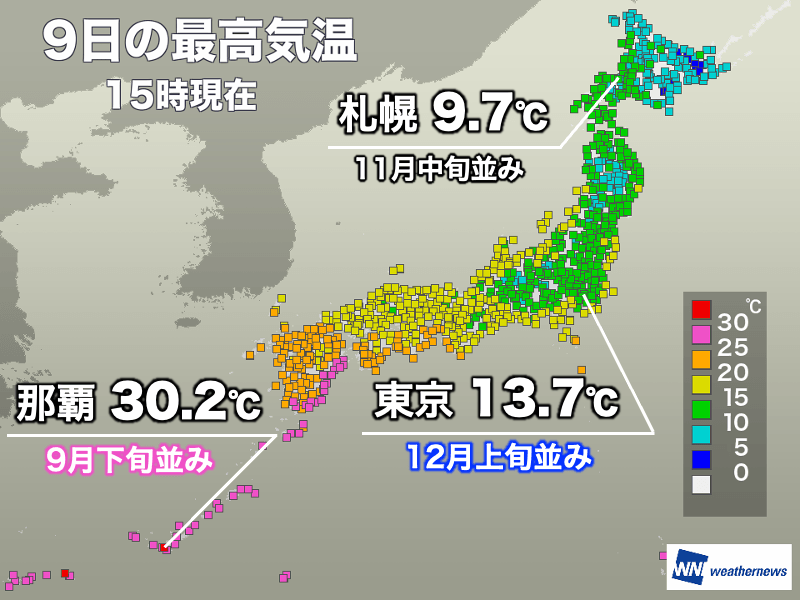 東京都心の最高気温13.7℃は、夜中の1時21分に観測した数字です。15時00分時点は12.8℃しかなく、12月上旬並みの気温となっています。