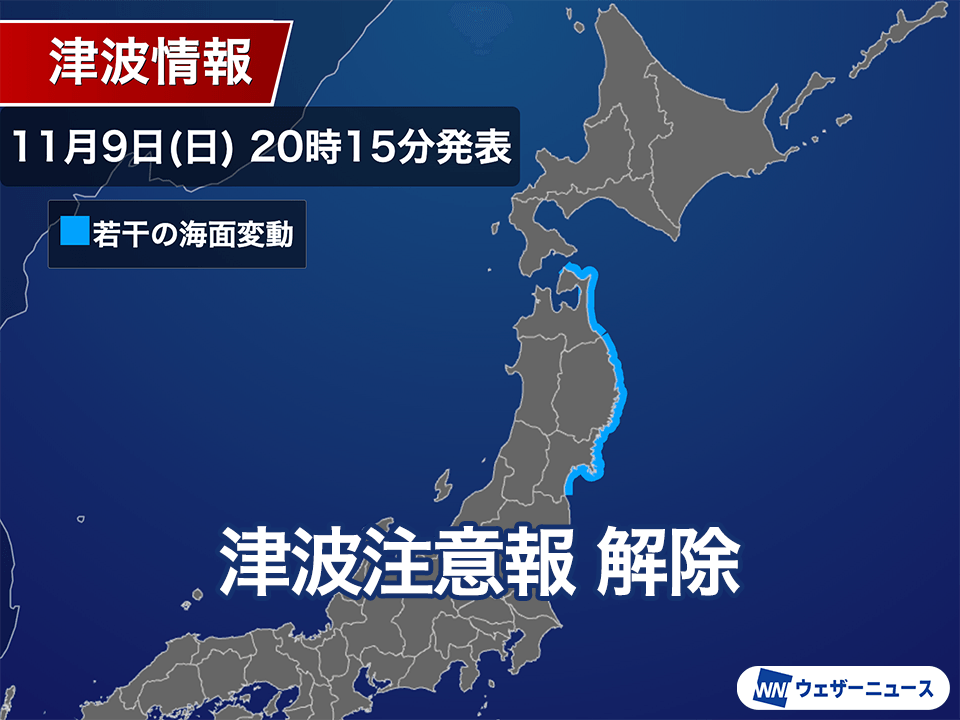 9日(日)17時03分に発生した三陸沖を震源とする地震の津波注意報は、津波が十分に減衰したため、20時15分に全て解除しました。