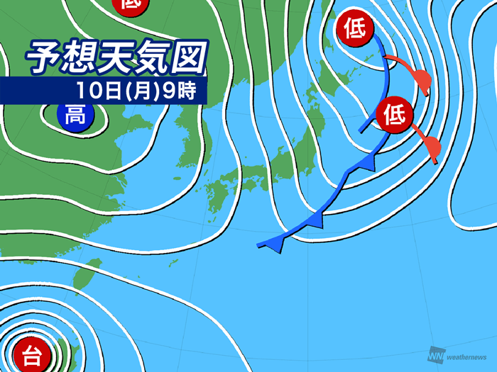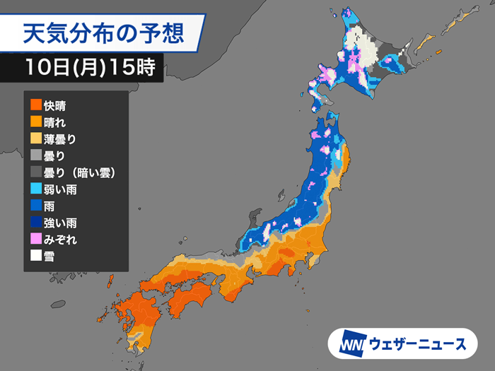 関東から西日本は太平洋側を中心に天気が回復して日差しが届きます。ただ、関東はシアーライン(風の流れが変化する境界線)の影響でにわか雨の心配があるため、折りたたみ傘を用意しておくと安心です。
