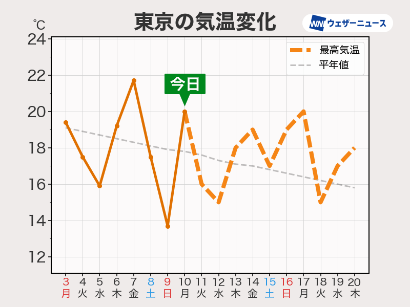 日毎の気温変化が大きいだけでなく、朝晩と昼間の気温差も大きくなるため、服装選びや体調管理にお気をつけください。