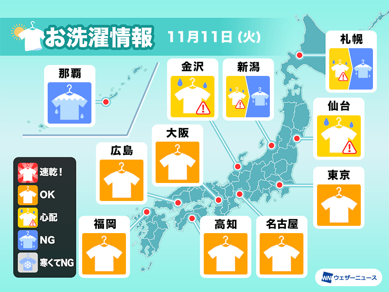 関東、東海、西日本では広く日差しが届き空気もカラッと乾燥しているため、外干しが捗るお洗濯日和となります。ただ、静岡県東部や北陸西部、山陰ではにわか雨の可能性があるため、心配な方は部屋干しがおすすめです。