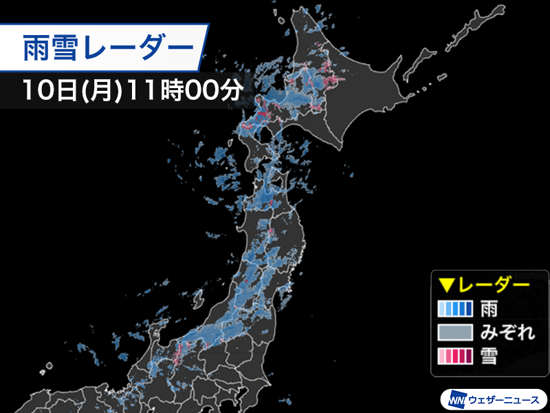 活発な雲が通過するタイミングでは一時的に雨や雪が強まったり、雷を伴うことがあるため注意が必要です。また、北西の風も強めに吹いているため、横殴りの雨になる可能性もあります。
