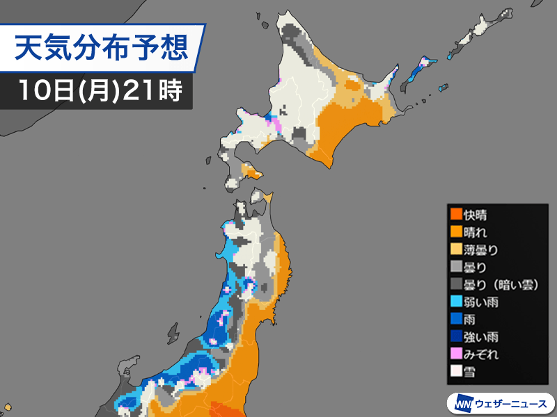 日中は雨の所が多い北海道では夜になると内陸部の市街地でも雪に変わる所が増える見込みです。東北北部の山沿いでも雪の所が増えてきます。明日11日(火)の朝にかけて旭川市などでは積雪の可能性があるため、路面状況の変化に注意をしてください。