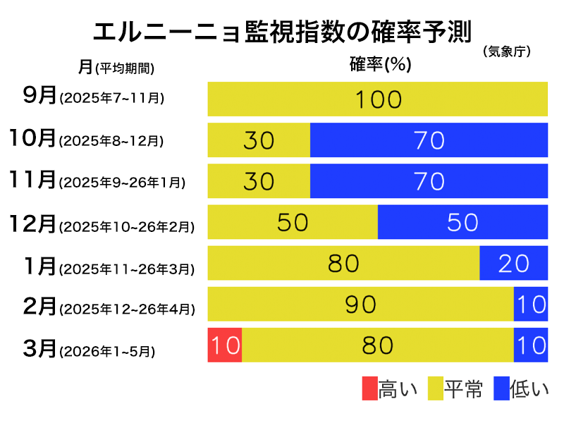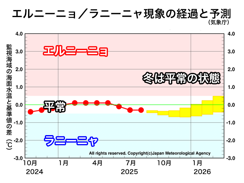 このためラニーニャ現象の発生には至らず、年明け以降は平常の状態が続く可能性が高いと見込まれています。