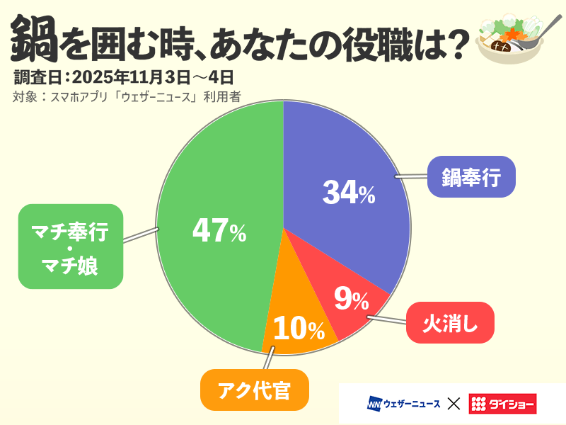 1)調査日:2025年11月3日(月)〜11月4日(火)質問:みんなで鍋を囲む時、あなたの役職は?