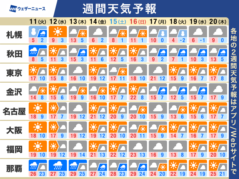 今日・明日〜2週間先までの週間天気予報今日・明日〜2週間先までの週間天気予報