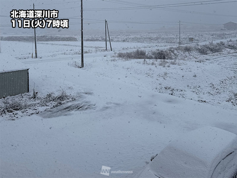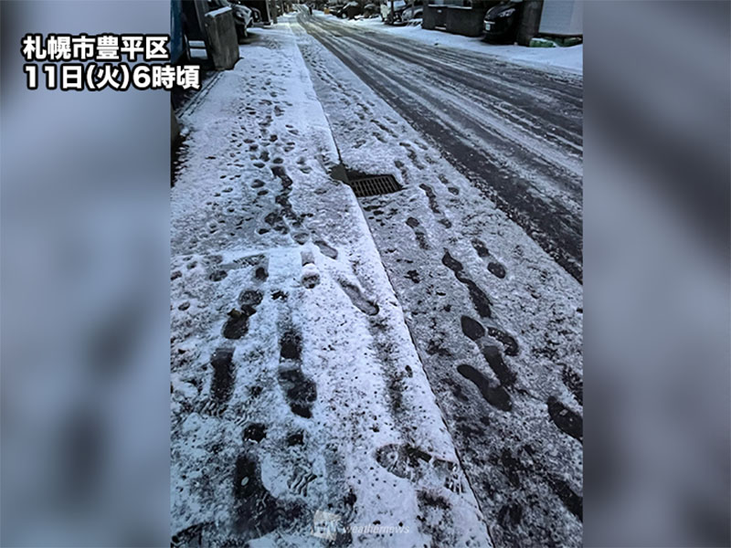 また、旭川市でも7時までに積雪深6cmが観測されていて、内陸部市街地でも雪が積もっています。札幌市内からも、道路が雪で白くなっている様子の写真が届きました。