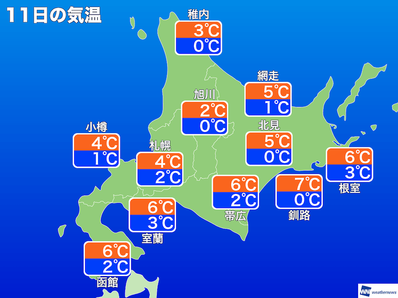 気温は昼間もあまり上がらず、最高気温は札幌市4℃、旭川市2℃、帯広市と函館市で6℃の予想と、寒い一日になりそうです。暖かい服装でお過ごしください。