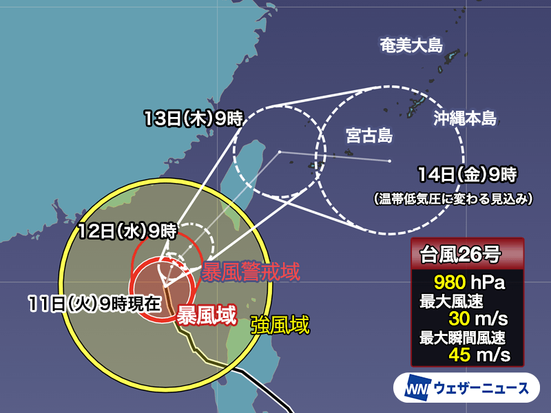 台風26号は次第に東寄りに進路を変え、明日12日(水)から13日(木)にかけて台湾付近を通過する予想です。台湾を通過することで勢力が弱まり、14日(金)には温帯低気圧に変わって沖縄に近づくとみられます。