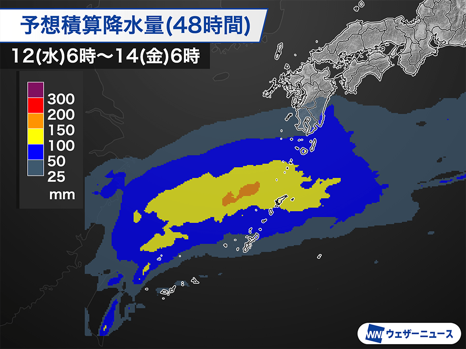 今日12日(水)も沖縄本島地方や奄美地方に活発な雨雲が広がる見込みです。一時的に激しい雨が降り、明日にかけてさらに100mm以上の雨が降るおそれがあるため、道路冠水や河川の増水、土砂災害などに警戒してください。
