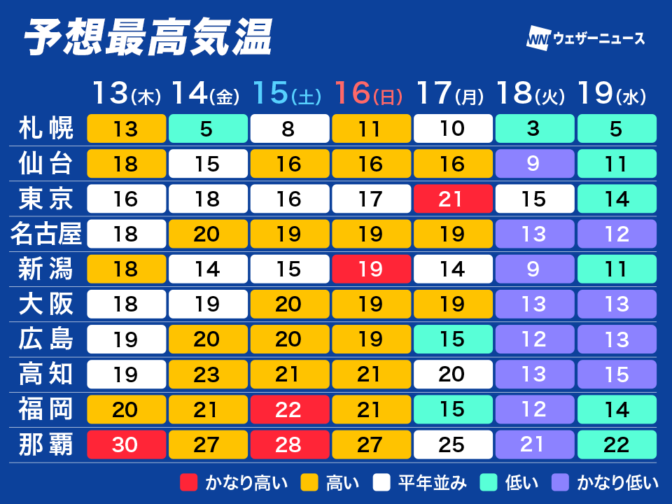 今週後半は寒気の影響が小さく、西日本を中心に気温が平年よりも高めの日が続きます。特に週末は気温が上昇して20℃を超える所が多く、北海道でも寒さが和らぎそうです。