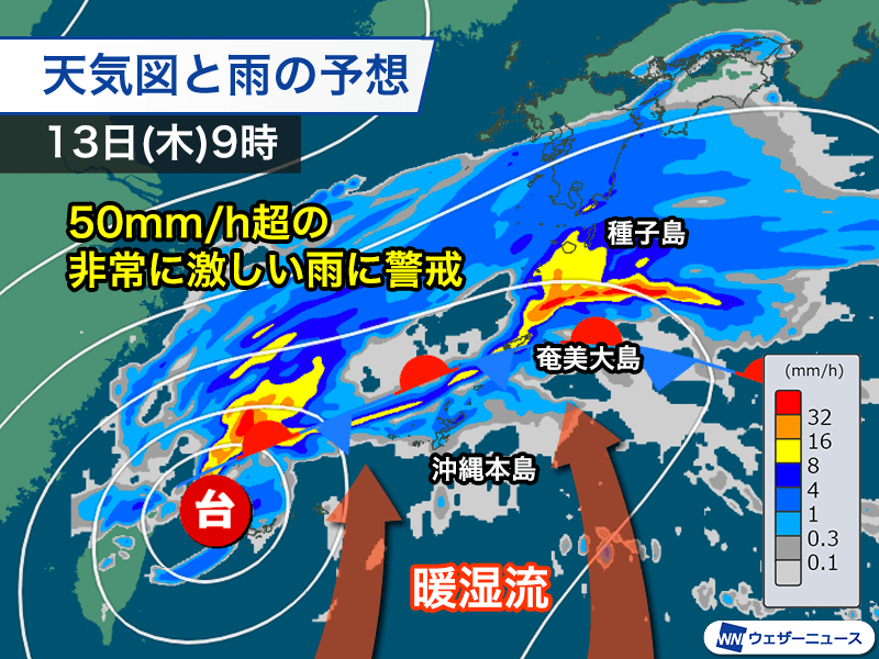 明日13日(木)は台風が近づくことで前線周辺の雨雲が再び発達しやすくなる見込みです。沖縄から奄美、種子島・屋久島では局地的に1時間に50mm以上の非常に激しい雨の降るおそれがあるため、道路冠水や低い土地の浸水、土砂災害などに警戒をしてください。