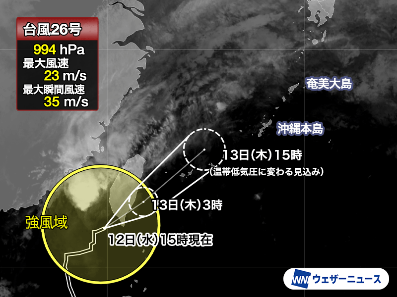 今後は温帯低気圧に性質を変えながら北東に進んで、明日13日(木)には先島諸島付近に達する見込みです。性質が変わることで、中心から少し離れた所で風の強まる可能性があるため注意をしてください。