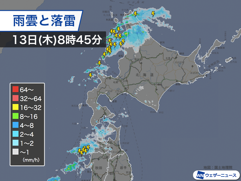 北海道の道北や東北北部などに活発な雨雲がかかり始めていて、8時40分までの1時間には北海道猿払村・浜鬼志別で11.5mm、稚内市・沼川で11.0mmのやや強い雨を観測しました。一部では雷も伴っています。