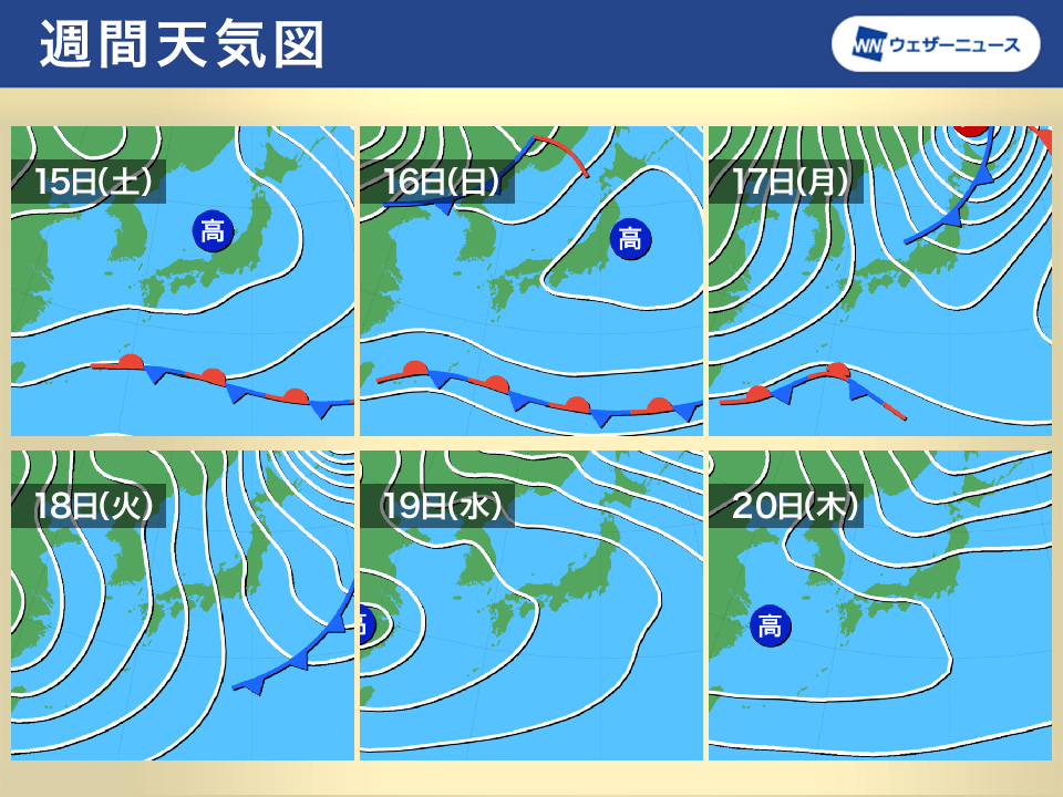 15日(土)は高気圧に覆われて晴れるところが多くなります。全国的に穏やかな天気の休日が期待出来そうです。