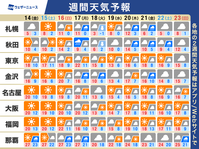 寒気の影響が比較的小さい東京都心も最高気温15℃止まりで、北西の季節風が強く吹くため体感温度はかなり下がる見込みです。冬用のコートや防寒具が必要な寒さの所が多くなりますので、週末のうちに準備をするようにしてください。