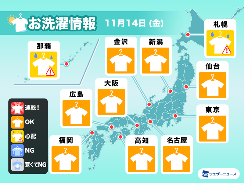 その他の各地は晴れるところが多く外干しには問題のない天気です。空気も乾燥していて、気温の割には乾きやすそうです。