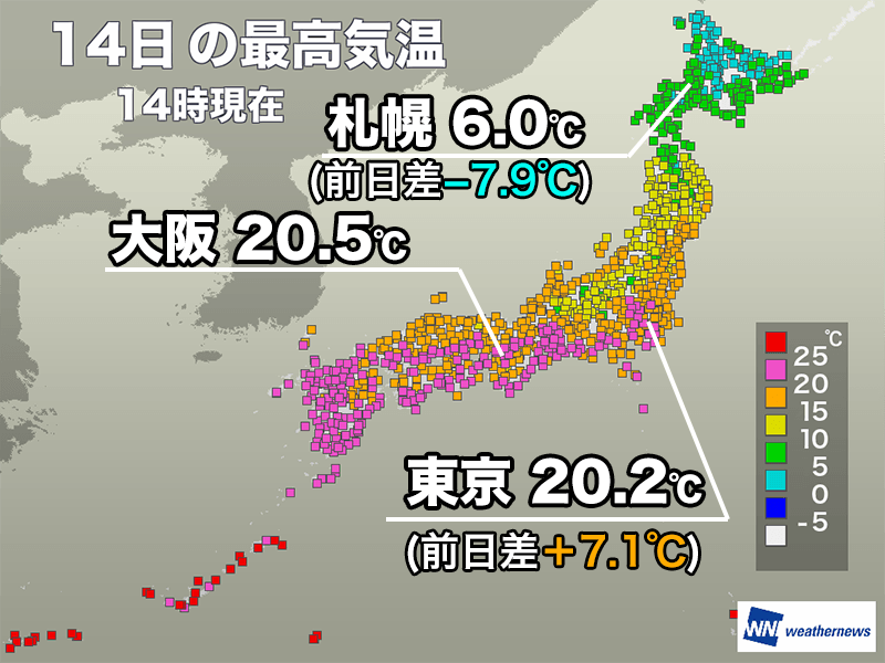 今日14日(金)14時までの最高気温は、福岡21.1℃、広島20.7℃、大阪20.5℃、名古屋21.2℃です。