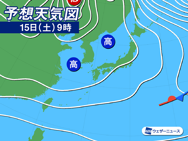 西日本や東日本は移動性高気圧に覆われ、穏やかな空となります。各地で青空が広がりお出かけ日和、紅葉狩り日和になりそうです。