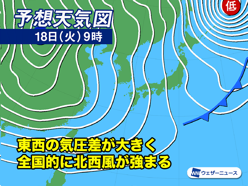 低気圧が発達することで日本付近では東西の気圧差が非常に大きくなり、風が強く吹きます。