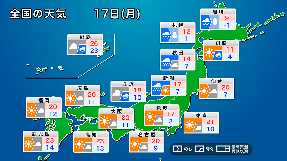 西日本や東日本は、明日17日(月)の朝もこの時期らしい肌寒さになる予想です。明日の予想最低気温は、東京10℃、名古屋9℃、大阪11℃、福岡12℃となっています。