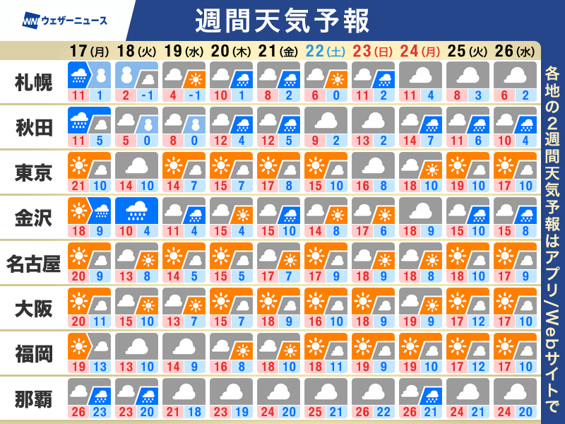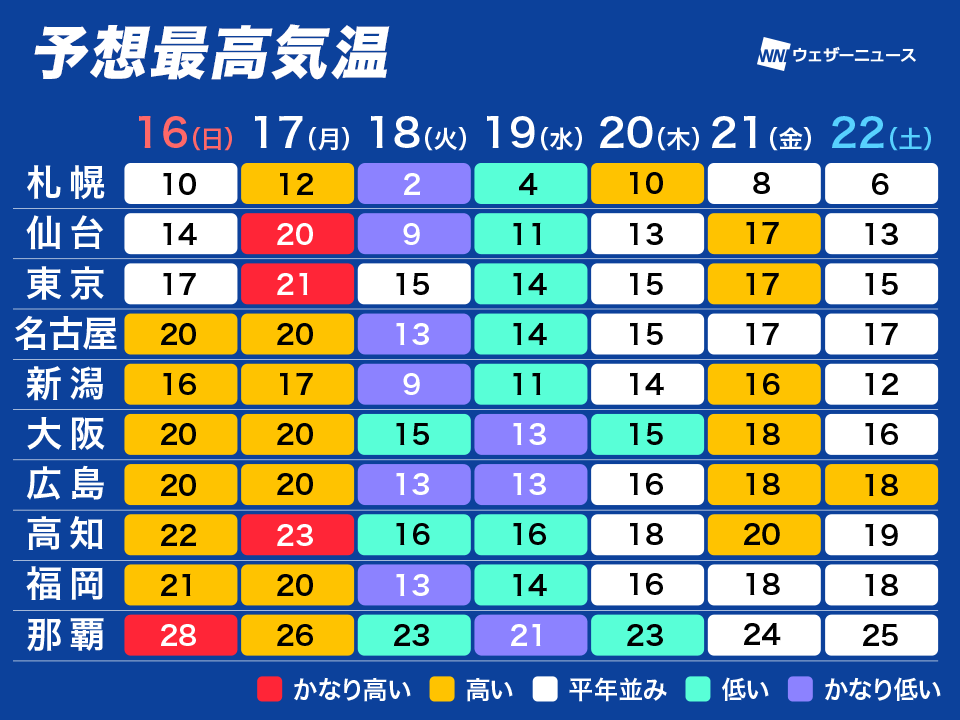 南下する上空の寒気の影響で気温が低下し、北海道では17日(月)夜から、その他の各地でも18日(火)から気温が一気に下がります。2〜3日の間に一気に2か月分くらい季節が進んだような体感変化となりそうです。