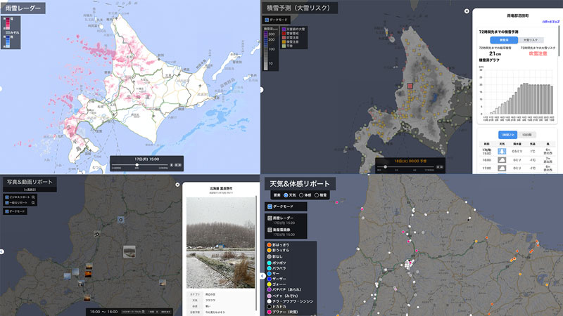17日(月)は、強い寒気の南下に伴い、夕方になって北海道の各地で雪が強まってきました。日没を過ぎたこともあって地上付近の気温が下がっているため積もりやすく、17時までの1時間には下川町で3cm、名寄市や富良野市では2cmの積雪増加が観測されました。