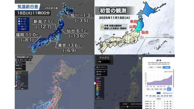 18日(火)は仙台でも初雪、青森・酸ケ湯で最早の積雪1m到達