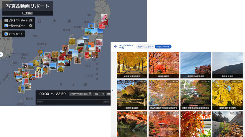 ウェザーニュース for businessの写真&動画リポートでは、キーワード「紅葉」などの検索や過去のリポートを振り返って見ることが可能です。