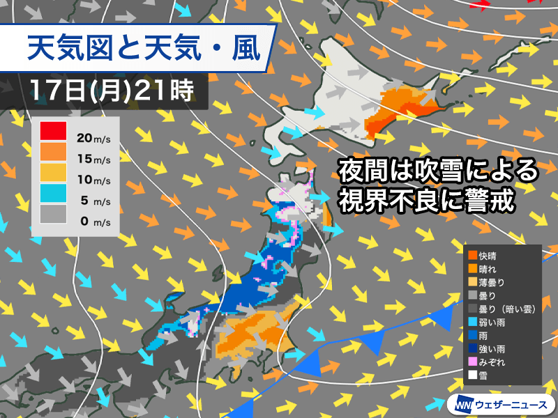 今夜21時の時点で北海道は日本海側を中心とした各地で雪になり、東北でも青森県を中心に雪になる見込みです。平均で15m/sを超えるような風が吹き荒れるため、雪の降る地域では吹雪になるとみられます。