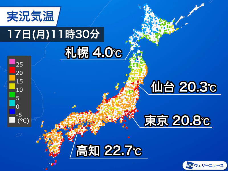 関東など午前中から20℃超える 北日本は気温が急速に低下