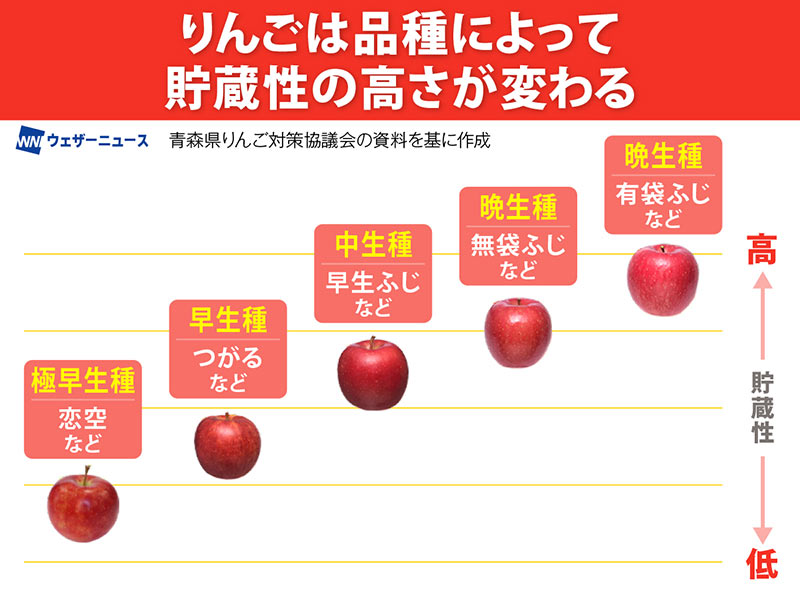 収穫してすぐの時期ならどの品種もおいしいのですが、『賞味期間』(おいしく食べられる期間)は貯蔵性の高さによって変わり、夏場に収穫されるりんごほど短く、秋も深まってから収穫される品種ほど長い傾向にあります。