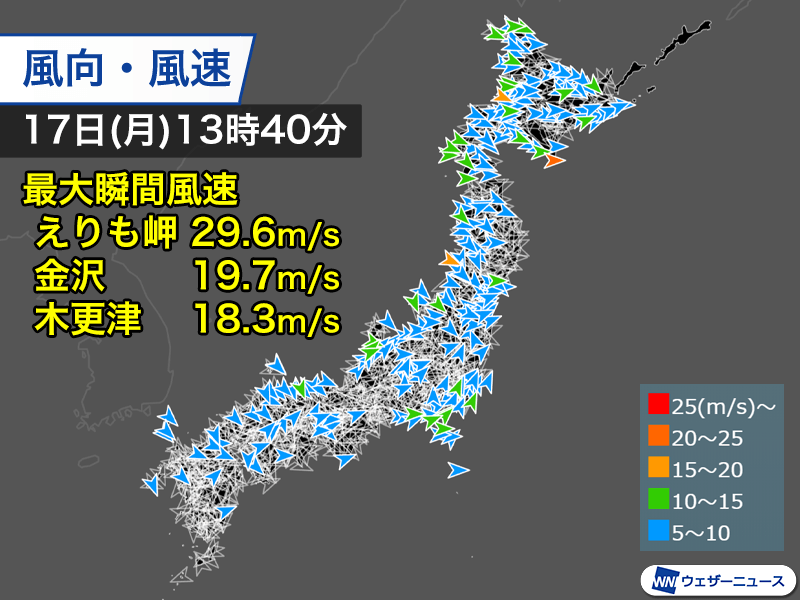 12時40分から13時40分に観測された最大瞬間風速は、北海道えりも岬で29.6m/s、山形県酒田市・飛島で20.9m/s、金沢市で19.7m/sを観測しました。今夜にかけて強い西寄りの風が続き、雪の降るエリアでは吹雪となるおそれがあるため、警戒が必要です。
