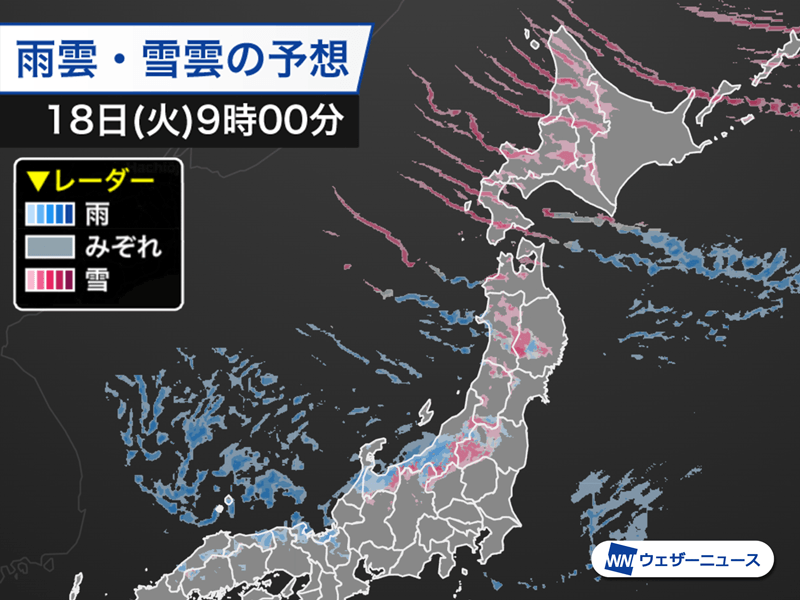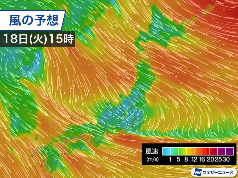 冷たい北西の風が強く吹き、昼間も気温は上がりません。暖かく感じた今日17日(月)とは一転して、昼間でも寒くなりますので、厚手の上着や冬用のコートなどをご用意ください。