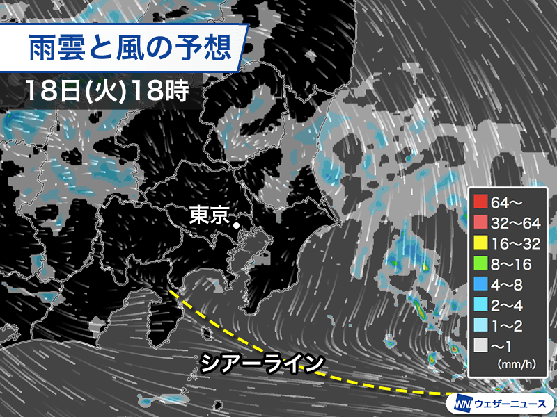 午後になると上空の気圧の谷が進んでくる影響で大気の状態が不安定になってきます。シアーライン周辺の雲が雨を降らせるくらいまで発達し、夜にかけて一時的に雨の降ることがある見込みです。