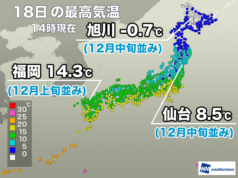 仙台市は8.5℃で12月中旬並み、福岡市は14.3℃で12月上旬並み。いずれも0時過ぎに観測した最高気温で、昼間はさらに寒くなっています。