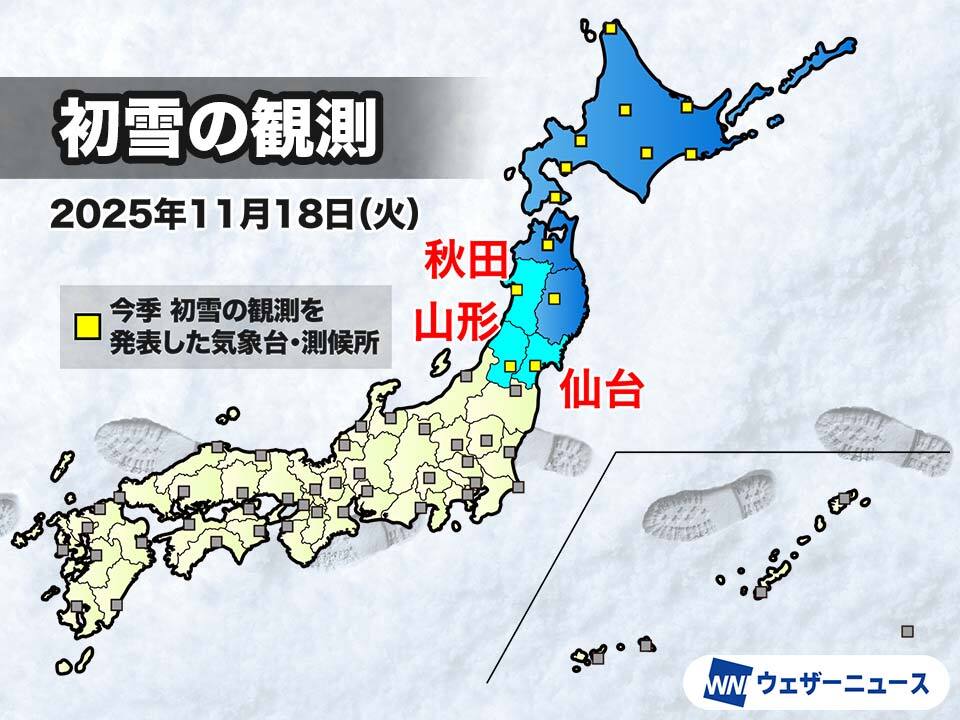 日本付近は冬型の気圧配置が強まっていて、東北は日本海側を中心に午前中から雪が降りました。未明には秋田、昼過ぎには山形で初雪を観測しています。