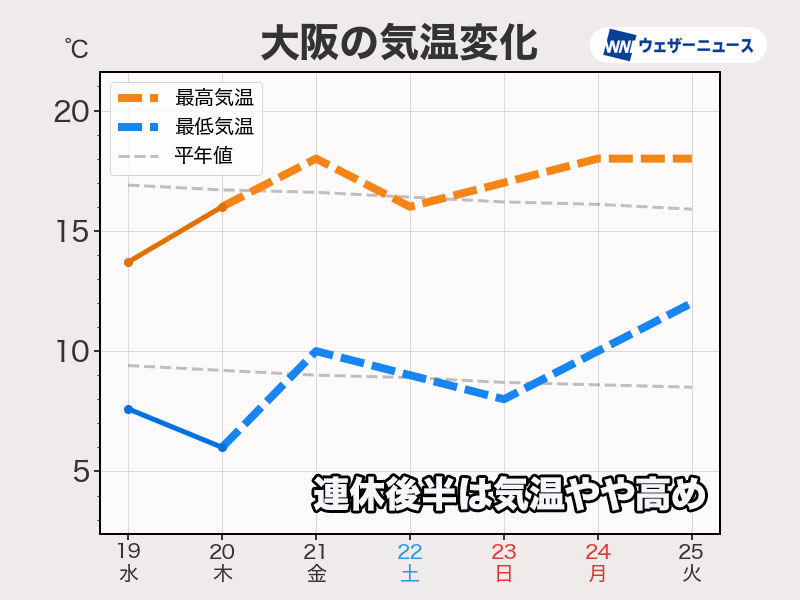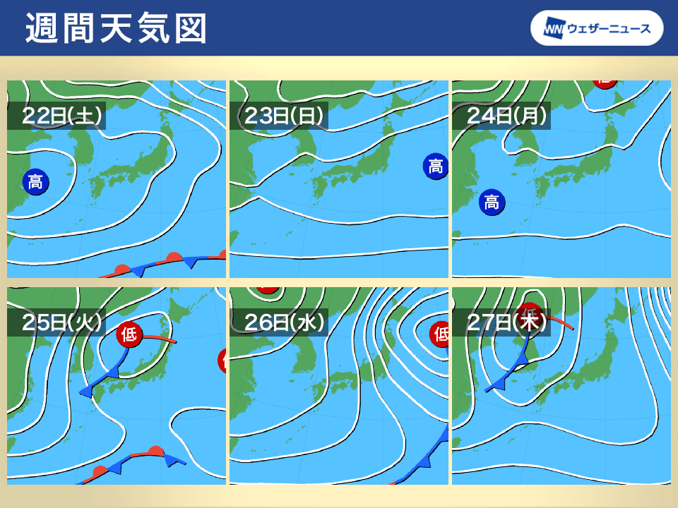 22日(土)の気温は概ね平年並みですが、23日(日)から24日(月)は気温が平年を上回るところが多くなる予想です。札幌では10℃を上回り、西日本でも20℃近くまで気温が上がるところがあります。
