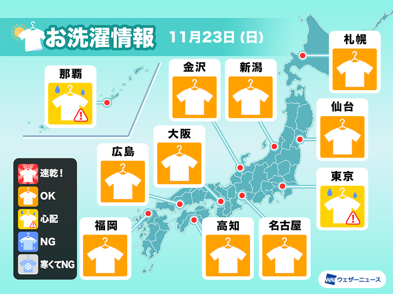 連休中日の今日も広い範囲で晴れて洗濯日和となります。雨の心配は少なく、外に干したままお出かけしても問題ありません。