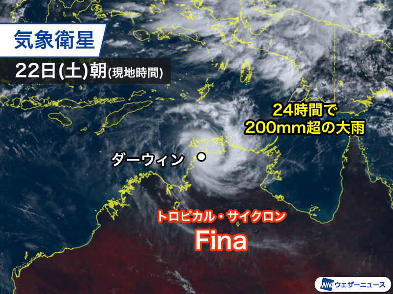オーストラリアの北の海上で発生した熱帯低気圧は次第に発達して、トロピカル・サイクロンFinaとなりました。現地時間の21日(金)夜にコーバーグ半島に上陸し、北部の主要都市であるダーウィンに接近しています。