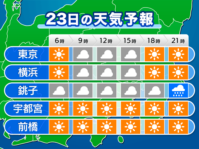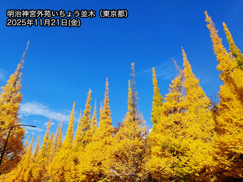 明日23日(日)は関東南部では雲が広がるものの、紅葉狩りを楽しむことができそうです。ただ、千葉県を中心に夜は雨の可能性が高まるため、お出かけはなるべく早めの時間帯がおすすめです。