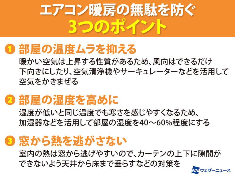 エアコン暖房の無駄を防いで効率的に使うには、部屋の環境づくりが大切だそうです。節電につながる3つのポイントは、次のとおりです。
